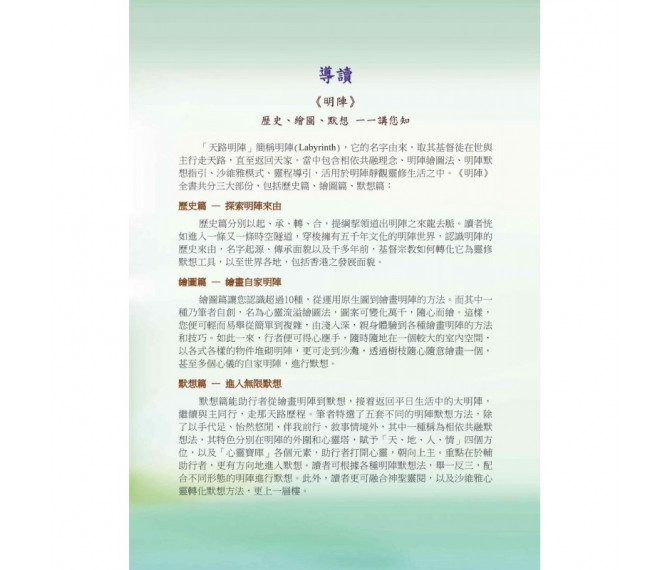 「感謝上帝,祂給了基督徒一個十分優良的靈修傳統,就是明陣(Labyrinth)靈修,讓我們學習讓上帝和我們一起行走。明陣讓我們的靈修操練涉及更深的層面,包括時間(temporal)、空間(spatial)、以及全人的身心靈。十分欣喜我們的主內同工陳立仁牧師,如今能將他帶領明陣靈修的經驗編寫成書,幫助我們華人信徒更好地使用上帝給我們這樣優美的靈修禮物——明陣——去實踐生命的深化及更新。陳牧師在書中對明陣有系統而且深入淺出的介紹,更幫助我們明白,隨了平日無可避免的『趕路』外,也留一點時間帶著靈性的觸覺走路。如此,我們會發現,原來人生的每一步都可以成為『與上主同行』的行動。」